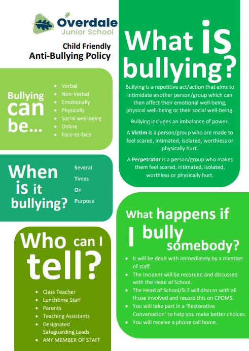 At Overdale Junior School we believe that all people have the right to come to school without the fear of being bullied. If bullying does occur, all pupils should be able to tell someone and know that the incident will be dealt with promptly and effectively.
